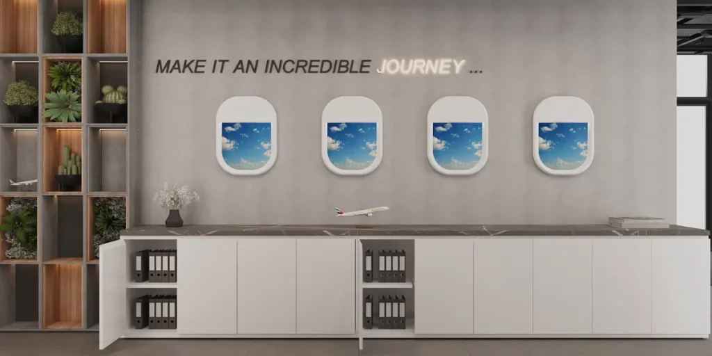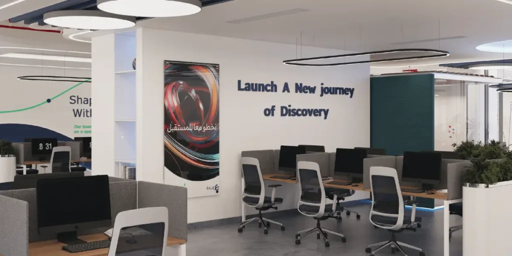 The Emirates Group office in New Cairo was an exciting opportunity for us! We were asked to blend the dynamic spirit of the Emirates airline with a practical, employee-friendly, and user-centered design. This office, spanning 700m², serves two purposes: not only to represent the airline’s luxurious brand, but also to include functional design elements. Our team used aviation-inspired details throughout the space to create the feeling of being on a flight while integrating practical additions like whiteboards, storage areas, and pinboards. These features were intentionally added to enhance workflow, encourage communication, and ultimately increase efficiency.