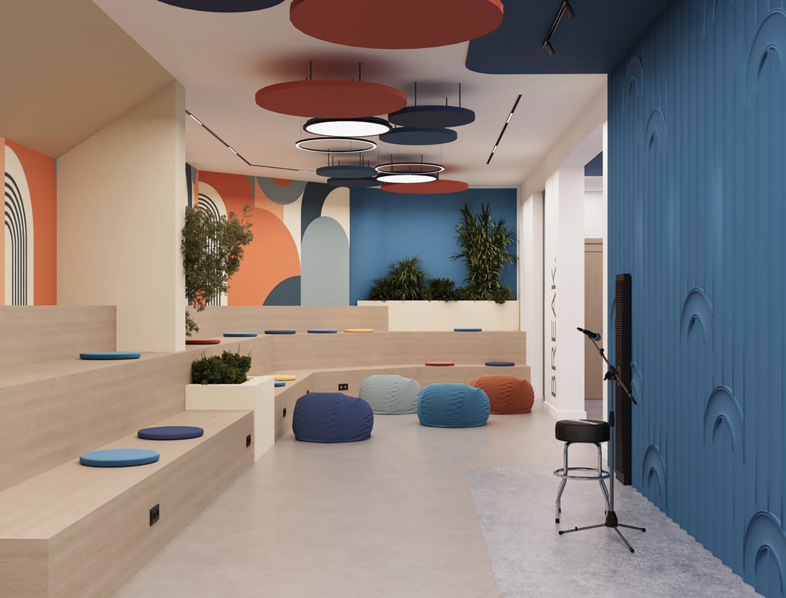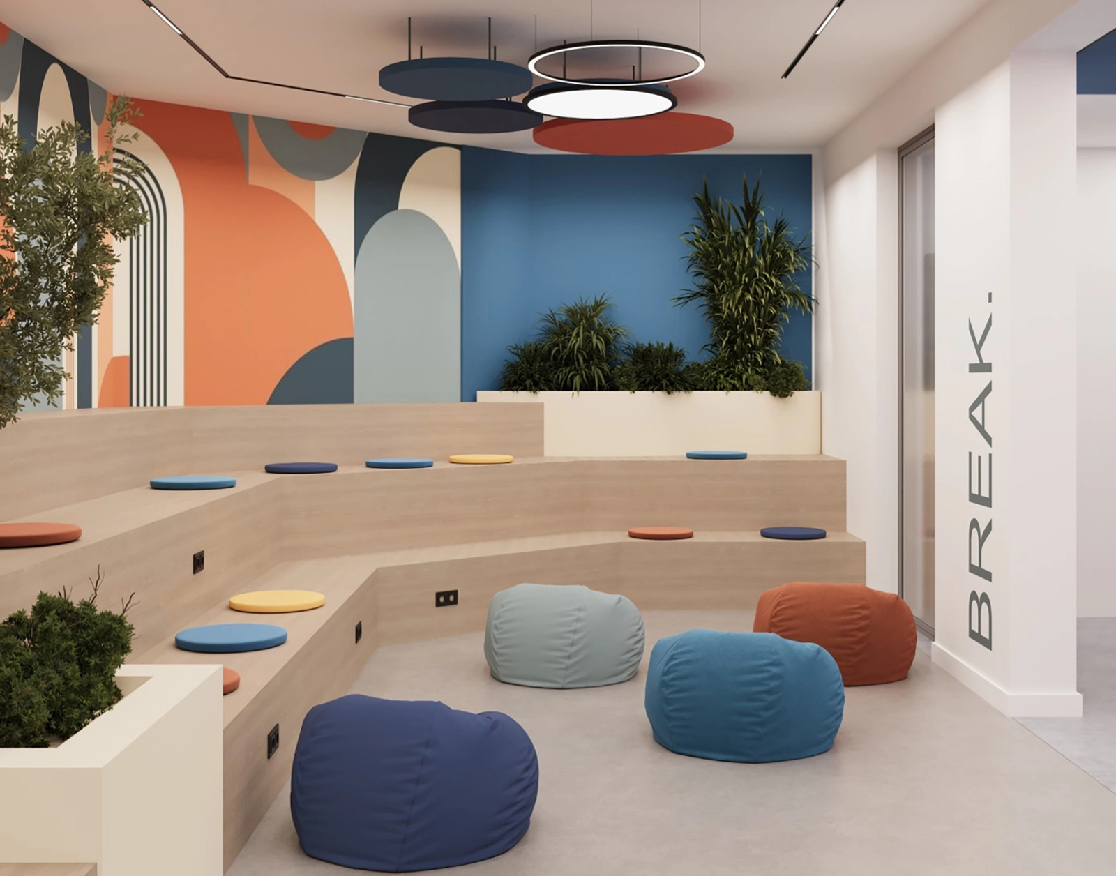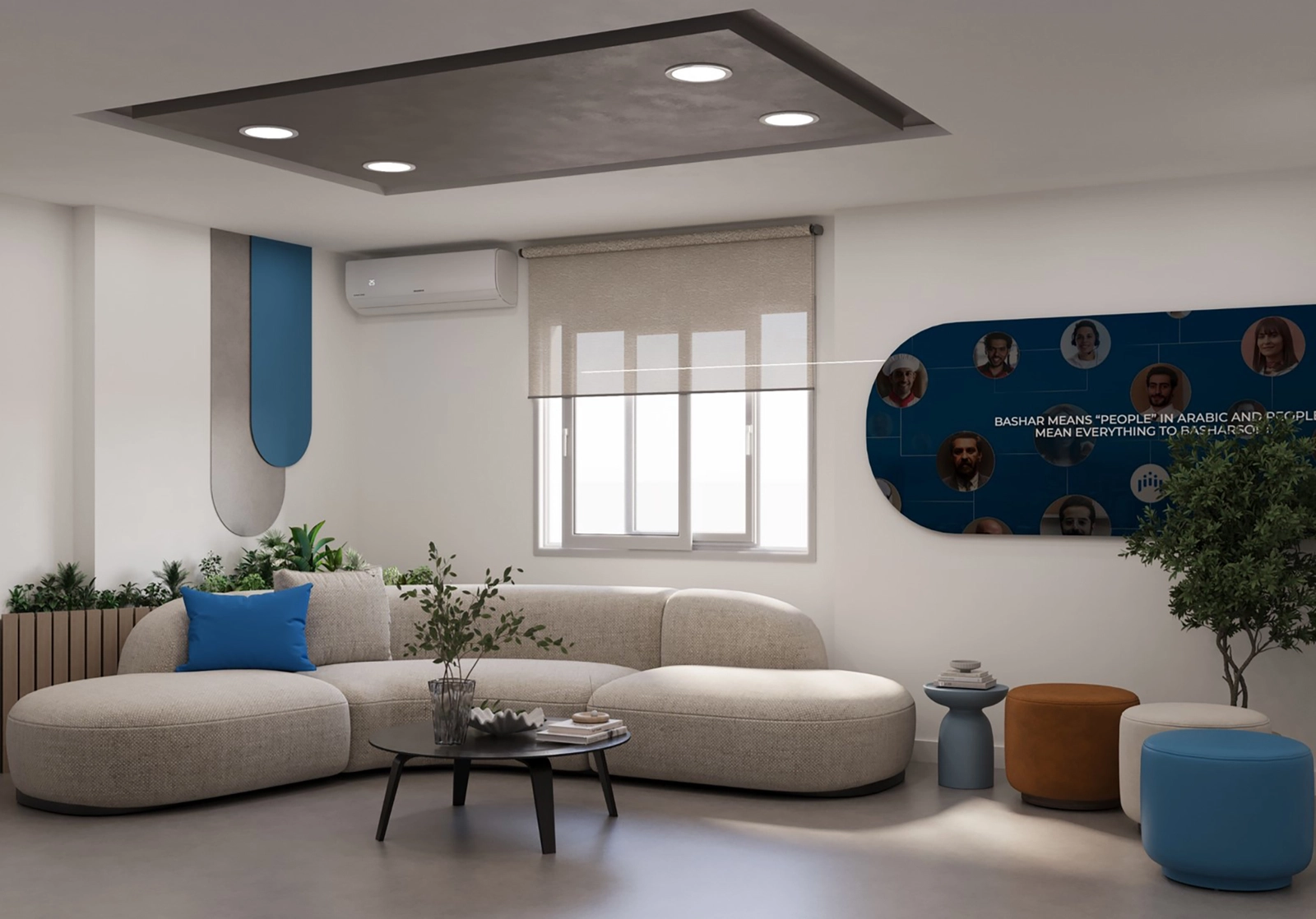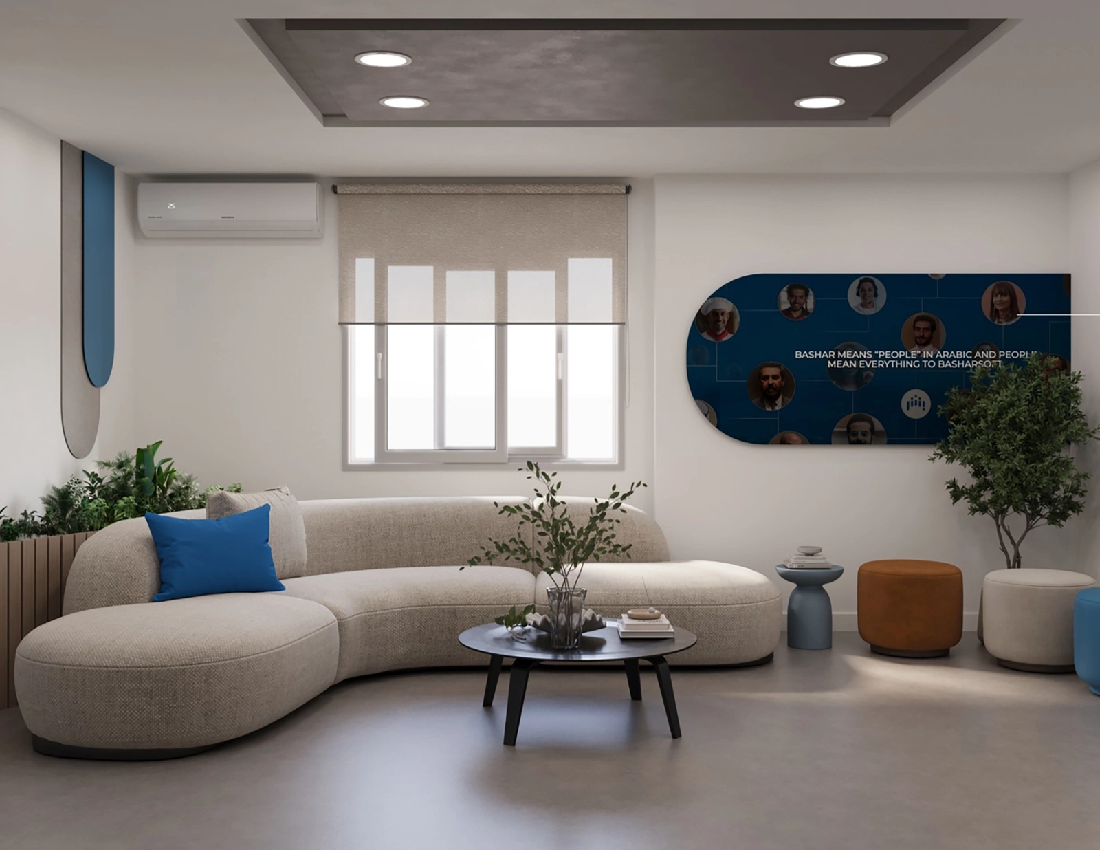 For Bashar Soft, the mother company of Wuzzuf and Forasna, we reimagined their office to reflect energy, creativity, and seamless communication. As part of our Office Interior Design Portfolio in Egypt, the renovation of the shared basement area offers a dynamic space for guests, events, and informal meetings. We used vibrant, energy-boosting colors to create an environment that feels both alive and productive. Acoustic walls ensure a noise-free experience while emphasizing the brand's identity, making this office a hub of creativity and collaboration.