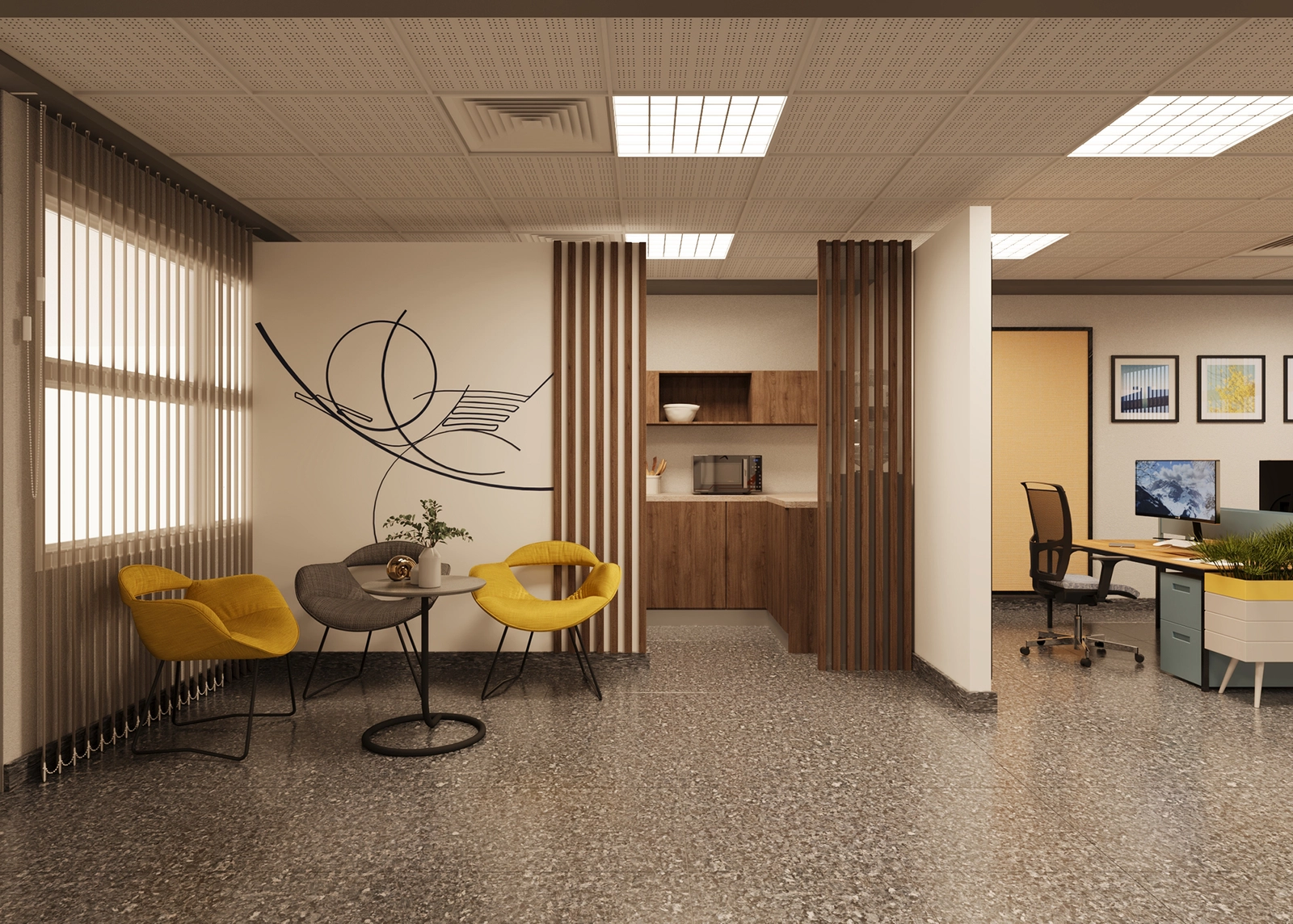 The layout focuses on practicality, optimized circulation, and straightforward material choices, reflecting a simple office interior design approach suited for high-traffic workspaces.