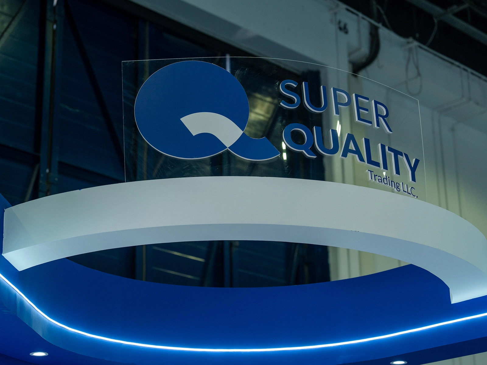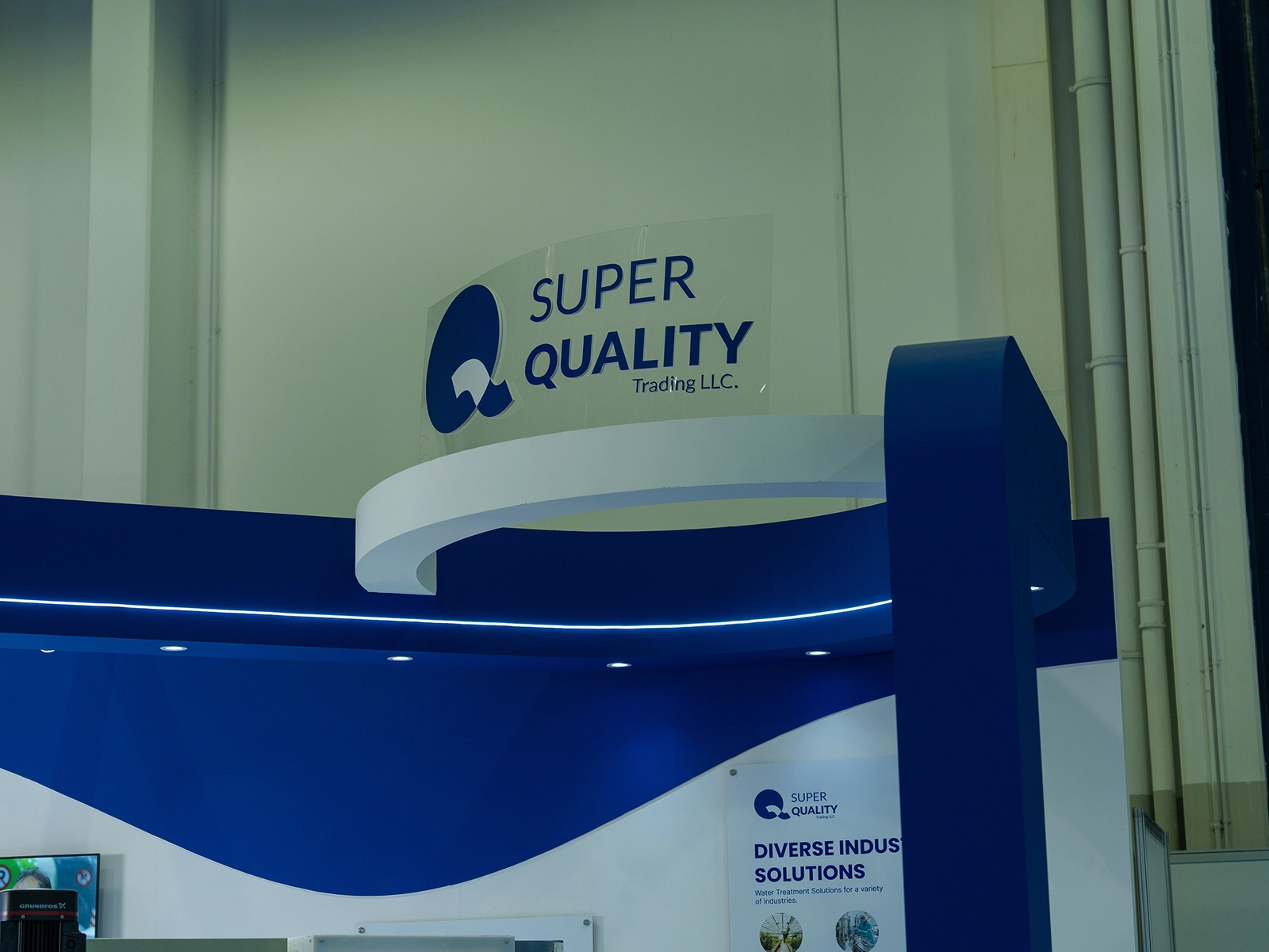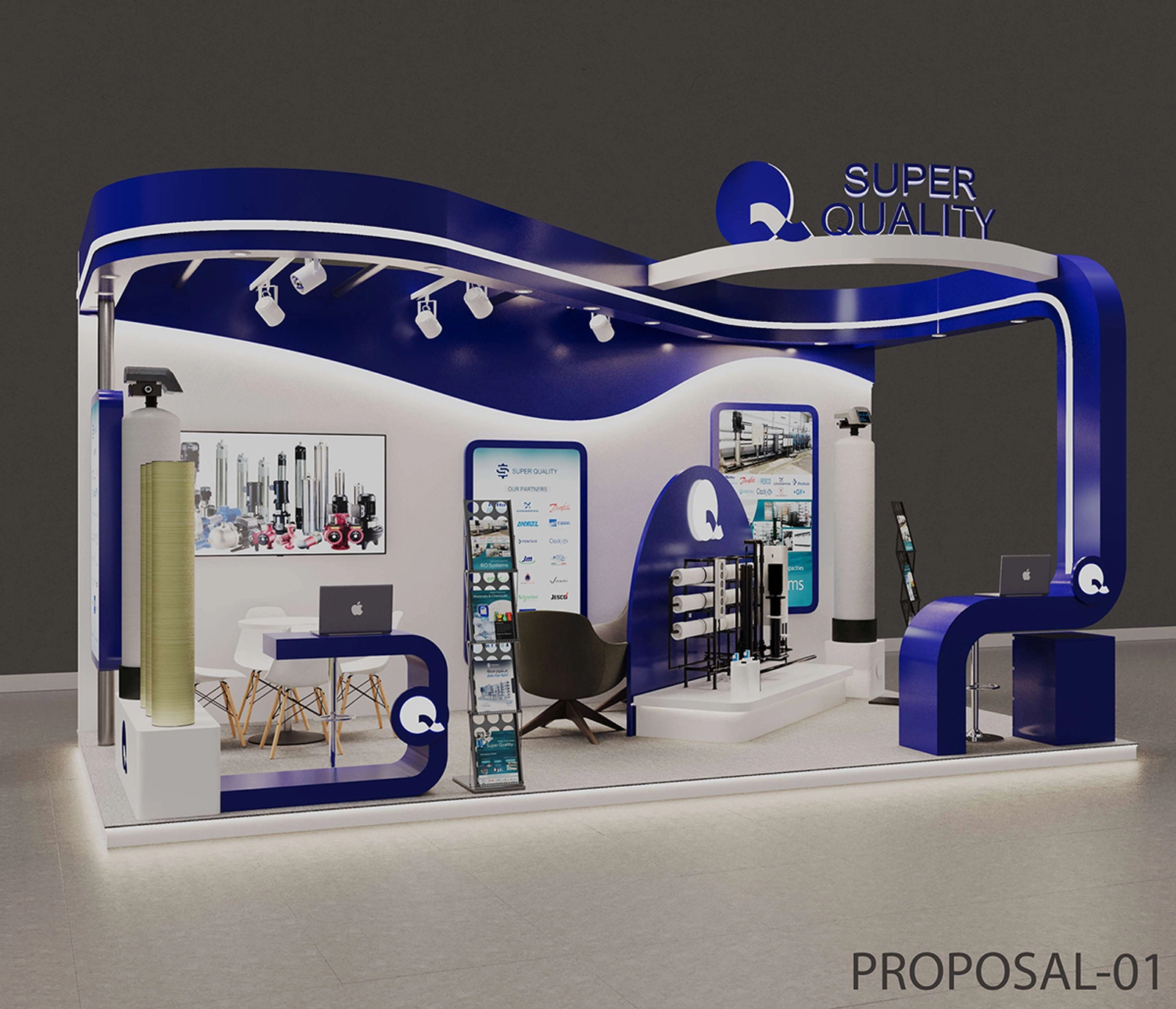 For the Super Quality booth, the design incorporated the brand’s distinct colors and visual identity, making sure it stood out among other displays. A lounge setup invited visitors to relax while an interactive screen showcased Super Quality's projects and expertise. We also featured a live display of their RO system, allowing attendees to see the technology in action, making the booth both informative and visually striking.